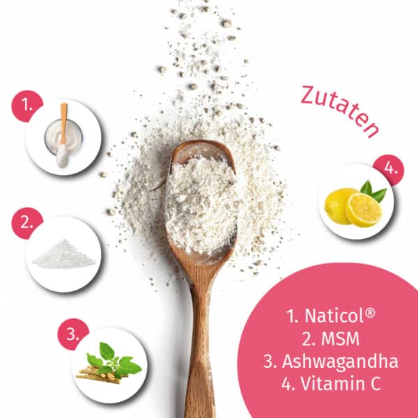 Sestavine: Naticol® hydrolysiertes Fischkolagenpulver (50%), Maltodextrin, MSM (Methylsulfonylmethan), Ashwagandha-Pulver, natürliches Erdbeeraroma (2%), natürliches Farbstoff aus Rote Bete, Stabilisator: Cellulosepulver, Vitamin C (Ascorbinsäure), Süßstoff Steviolglycosid.