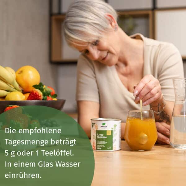 Die empfohlene Tagesmenge beträgt 5 g bzw. 1 Teelöffel. In ein Glas Wasser einrühren.